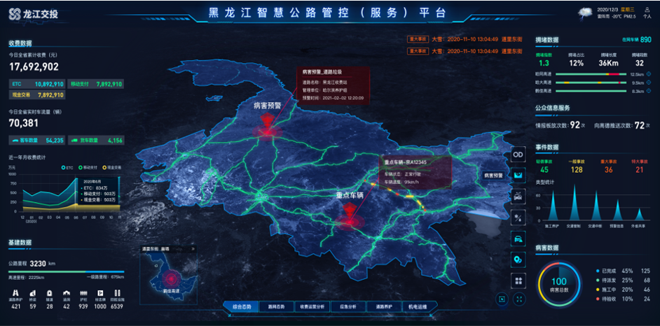 • 全面提升了黑龙江高速公路智能管控和精准服务能力,实现高速公路省级业务一网统管的智慧高速云控平台。